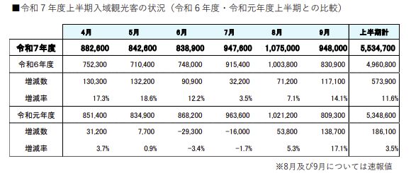 沖縄県が発表する『令和7年度上半期沖縄県入域観光客統計概況(速報)』によると、令和7年度上半期、沖縄を訪れた観光客は553万4700人に上り、対前年度比較では+57万3900人(+11.6%)、