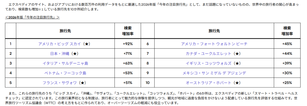 2026年に向けた旅行トレンドレポート、Expedia グループが発表した「Unpack ’26」において、2026年の注目の旅行先として 沖縄県 が世界第2位にランクインしたことが発表されました。