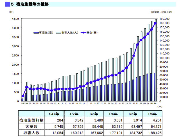 沖縄県が毎年公表している『宿泊施設実態調査』によると、令和6年12月31日時点での宿泊施設数は前年比108.8%の4,251施設に達しました。