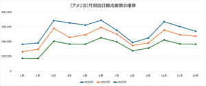 アメリカ市場は滞在日数が長く、消費単価が高いのが特徴です。訪日タイミングには大きな変化は見られず、安定した傾向が見られます。訪日ピークは春の桜シーズン、夏休みシーズン、そして秋の紅葉シーズンとなります。アメリカの祝日は3連休規模が中心ですが、学校休暇や有給休暇を組み合わせて旅行するケースが多く、結果として1週間以上の長期滞在になる傾向があります。