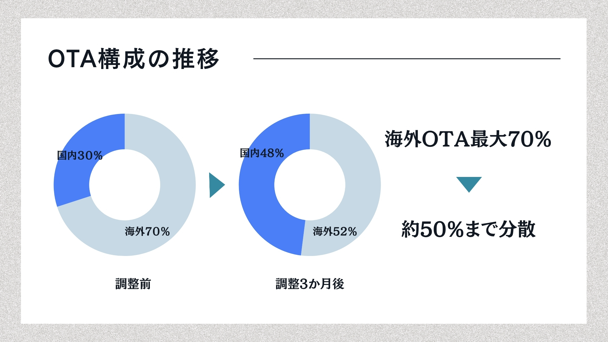 OTA構成を整え、売上を維持しながら成長を実現。「特定のOTAに依存しており、リスクが気になる」 「チャネルを増やしたいが、売上が落ちるのが不安」 多くの宿泊施設様が抱えるこの課題に対し、 本事例では料金設計・プラン構成・販促施策を見直すことで、 …